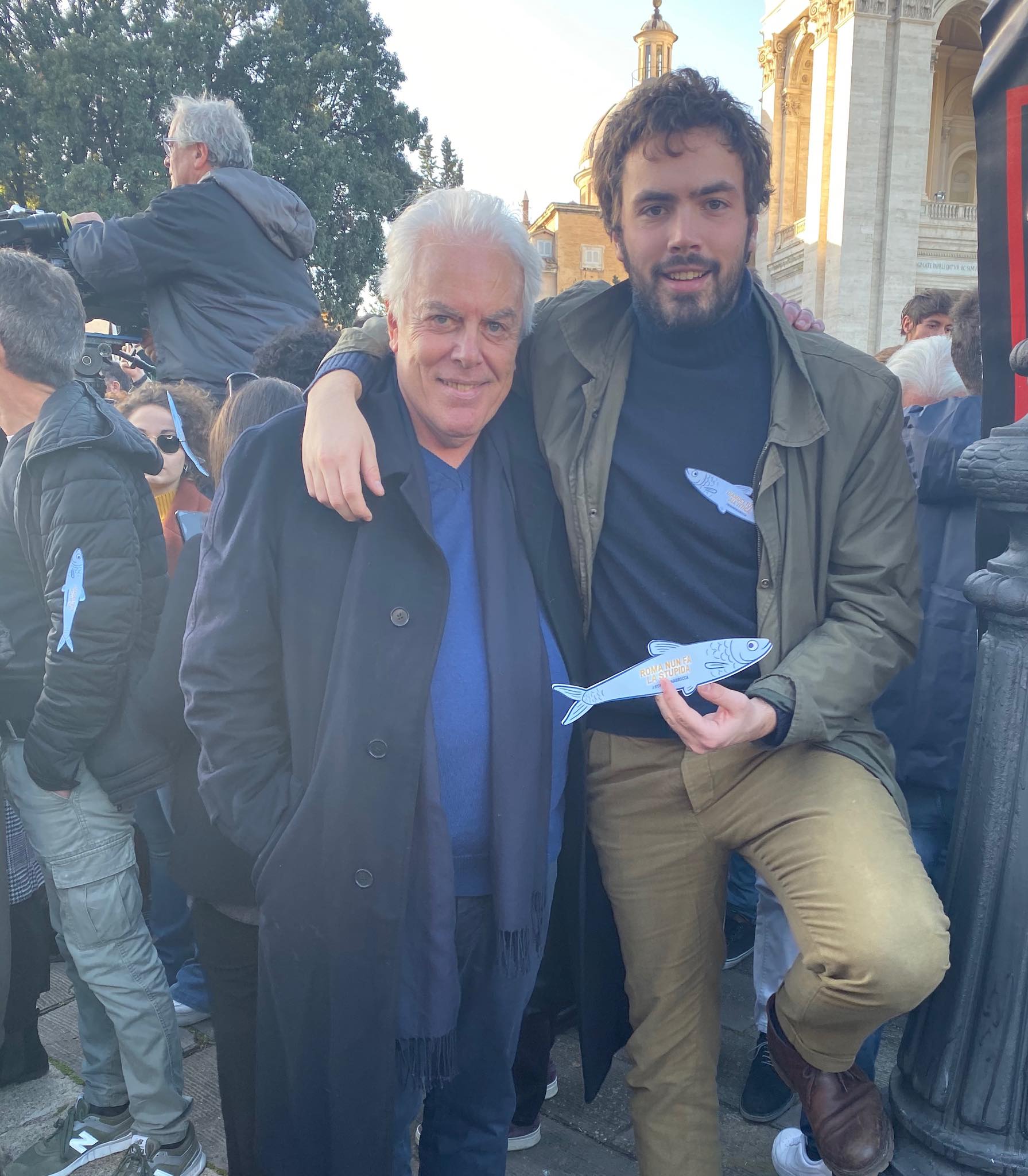 Immensa Roma, San Giovanni vestita di gioia, la capitale che canta Bella Ciao, l’Inno di Mameli e si tramanda da una generazione all’altra i begli articoli fondanti la nostra Costituzione. Roma che scandisce ora e sempre Resistenza, un branco di Sardine strette schiacciate l’una all’altra, Roma partigiana, antifascista, antirazzista, piena di giovani di tutte le età che invocano una nuova politica alta, non quella rasoterra che ci sorbettiamo via tweet. Non più piazzisti di voti, ma richiesta di statisti che si decidano a lavorare davvero, con i valori di sempre oggi buttati in cantina, a Montecitorio come a Bruxelles, per un’Italia libera, multietnica, multiculturale. Roma città aperta all’ambiente, ai giovani, al futuro. In questo oceano di gente ho cantato con uno dei miei figli (l’altro è un pesciolino rosso resistente di Milano) la canzone dei partigiani, e dietro le nostre palpebre c’erano i nostri padri e nonni, e i loro padri morti per l’Italia. Non è retorica è amore per la tua famiglia e per il tuo Paese. E non c’è nulla di più bello, per me come per tanti altri stasera, che avere a fianco i figli, emozionati ma severi, indisponibili a diventare futuri schiavi di una politica di bassa lega.